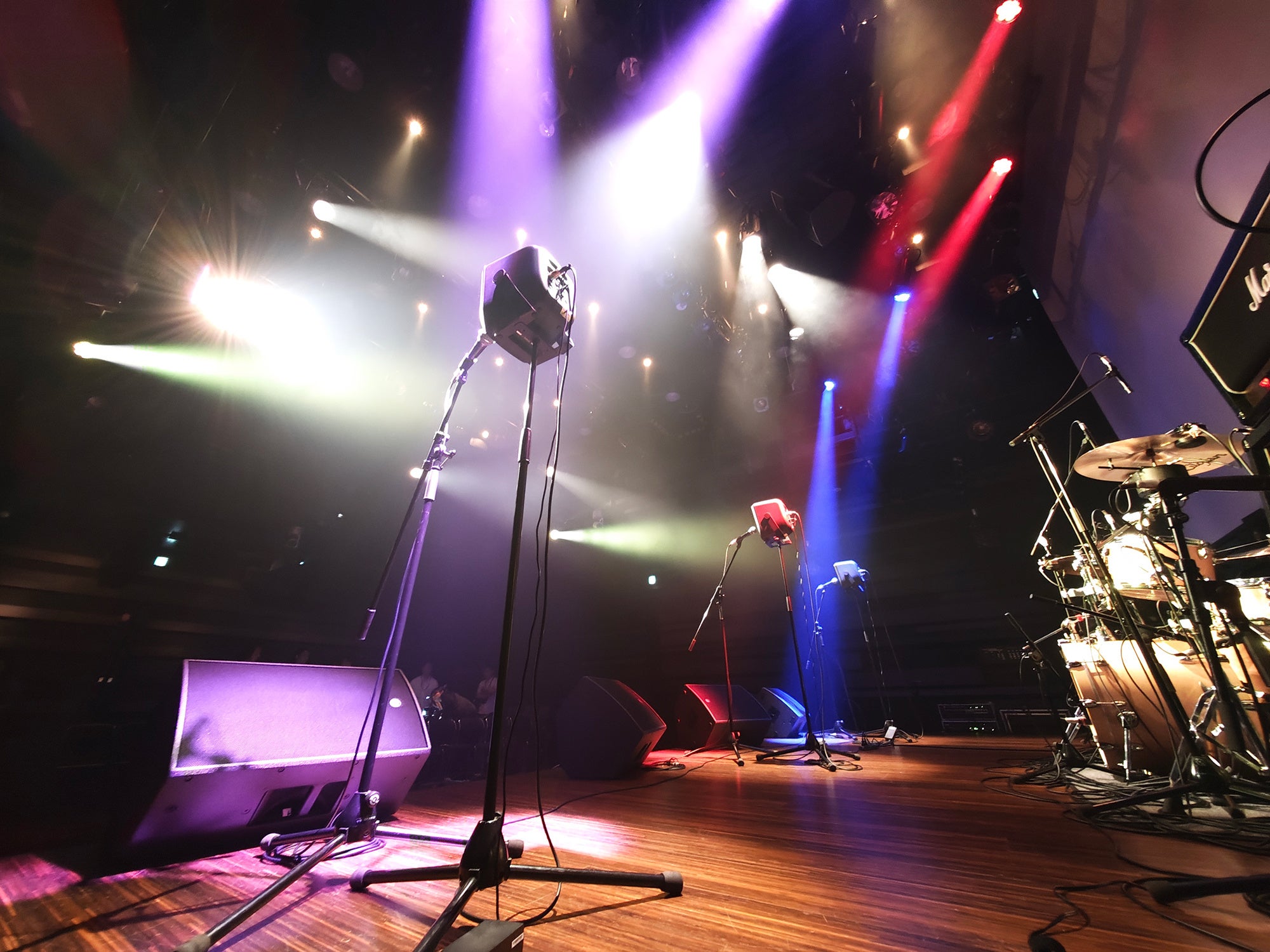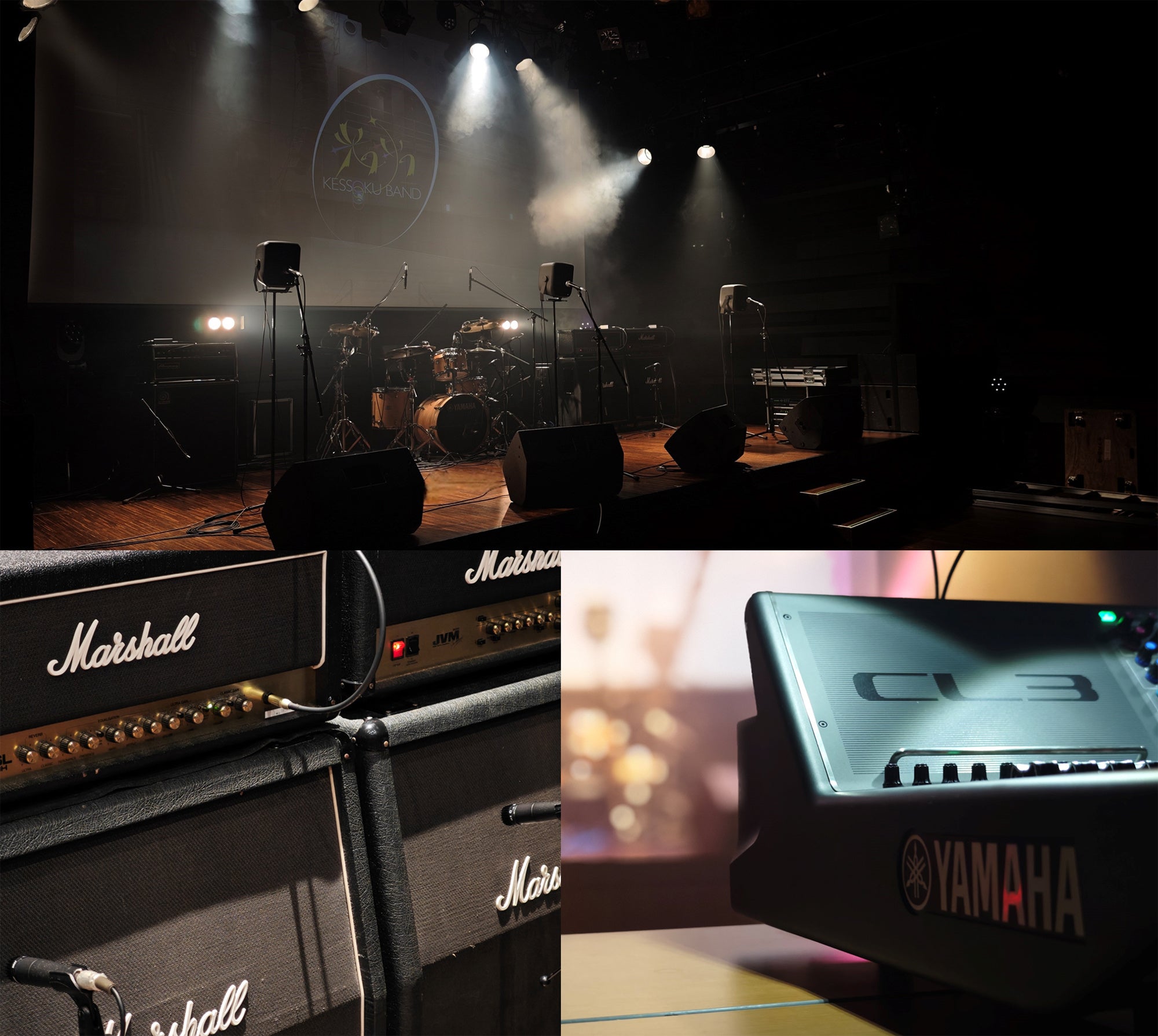 通常ライブハウスでライブを行う場合と同様のマイキング・音響システムによる音響、映像、照明演出を行っています。また、各メンバーの身長に合わせた発音位置に歌唱・MC用スピーカーの設置や足元には演奏のモニターを行うスピーカーの設置を行い、ステージの中の音の再現にも挑戦しています。