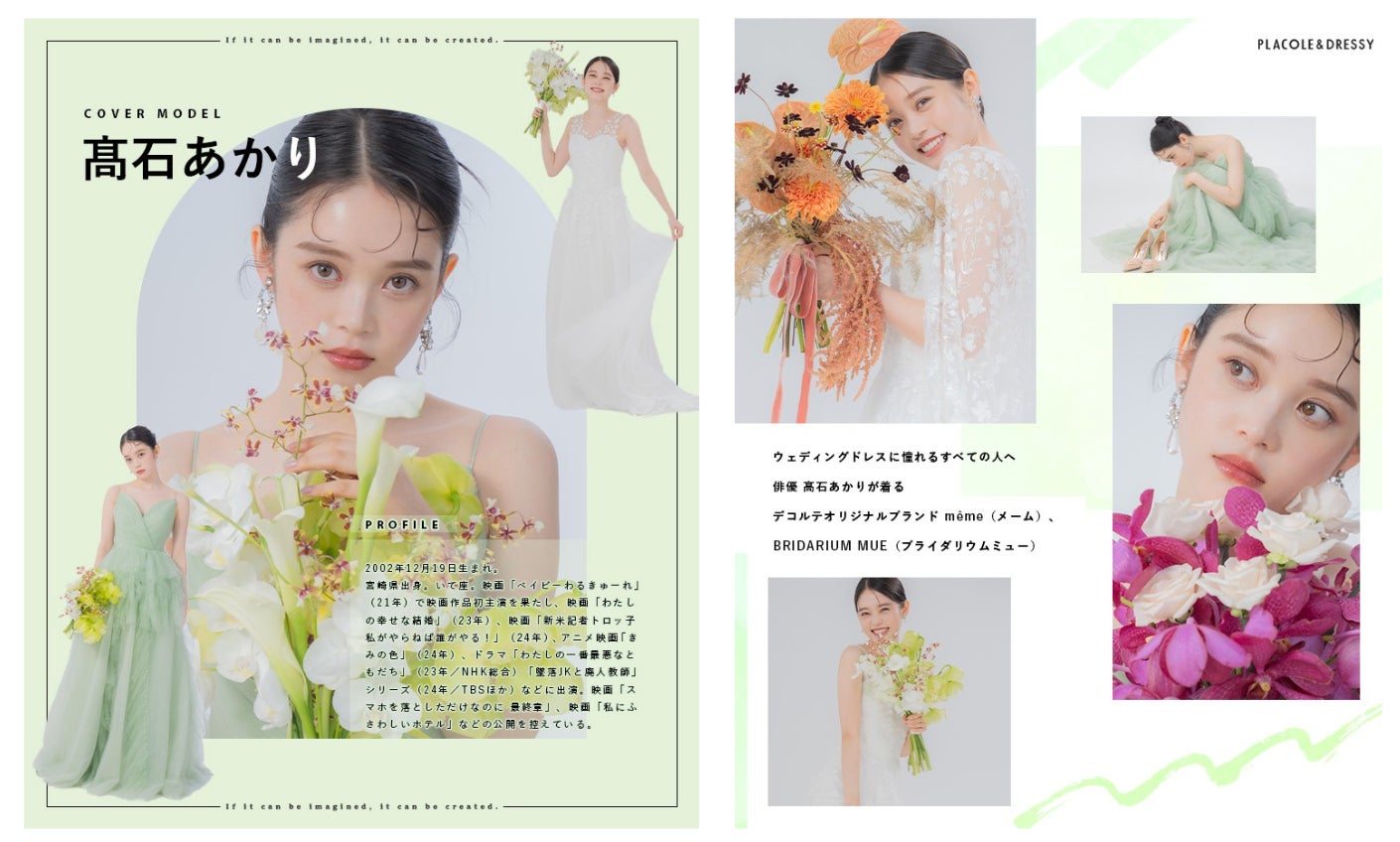 ウェディングドレスに憧れるすべての人へ。DRESSYが贈る、特別コンテンツ。10月号は俳優として活躍する髙石あかりさんがデコルテオリジナルブランド même(メーム)のカラードレス/BRIDARIUM MUE(ブライダリウムミュー)のウェディングドレスを着て登場。着用したコーディネートのポイントやウェディングドレスの魅力、髙石あかりさんについて DRESSY編集長 武藤みなみよりインタビューさせていただきました。