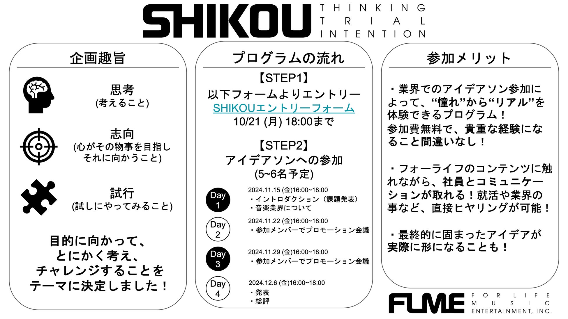 株式会社フォーライフミュージックエンタテイメントは、初めての試みとして学生向けのアイデアソン‘‘SHIKOU’’の開催を決定した。