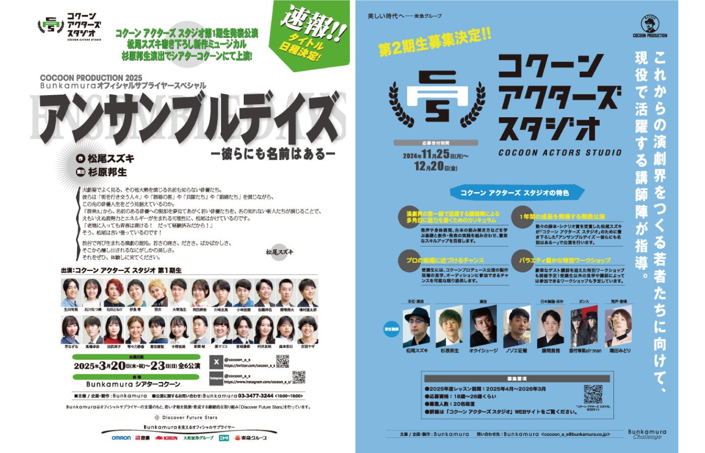 「コクーン アクターズ スタジオ」第1期生の1年間の集大成となる発表公演のタイトルが『アンサンブルデイズ―彼らにも名前はある―』に決定。松尾スズキが発表公演のために書き下ろす新作ミュージカルを、骨太な演目に果敢に次々と挑み話題を呼んでいる杉原邦生が演出します。さらに第2期生の募集も決定。第1期に引き続きシアターコクーンゆかりの講師陣が担当し、1年間のカリキュラムを経て演劇で求められるさまざまなスキルの習得を目指します。