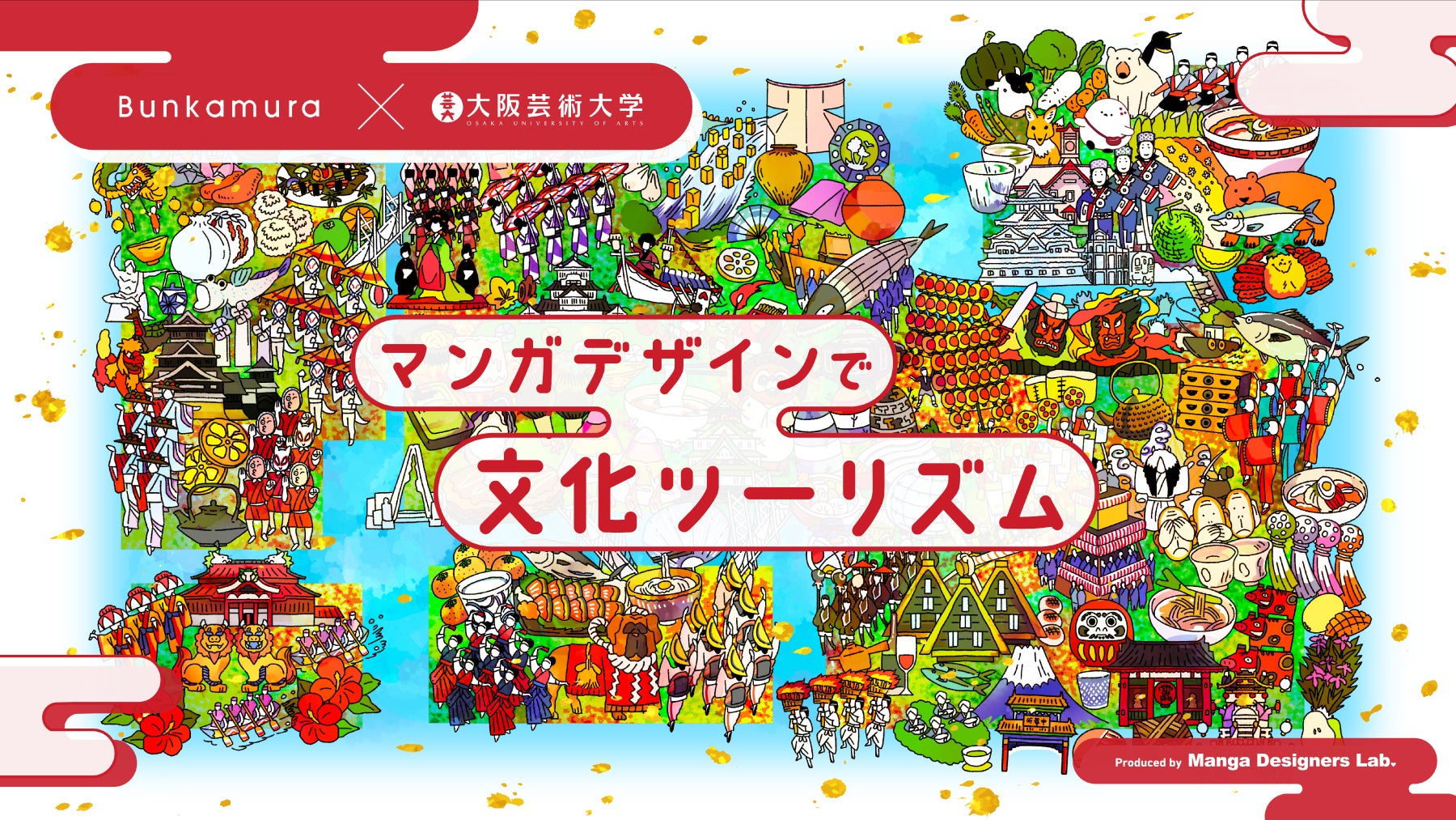 Bunkamuraオープンヴィレッジでは「マンガデザインで文化ツーリズム」を始動。マンガデザインという新たな手法を通じて、日本の「文化」を紹介し、ツーリズムへ誘うきっかけを創出するプロジェクトです。歴史や祭、建造物、伝統工芸や地域を象徴する風景など日本各地のさまざまな魅力を、大阪芸術大学の学生たちのまなざしで描き出したマンガデザインでお届けします。