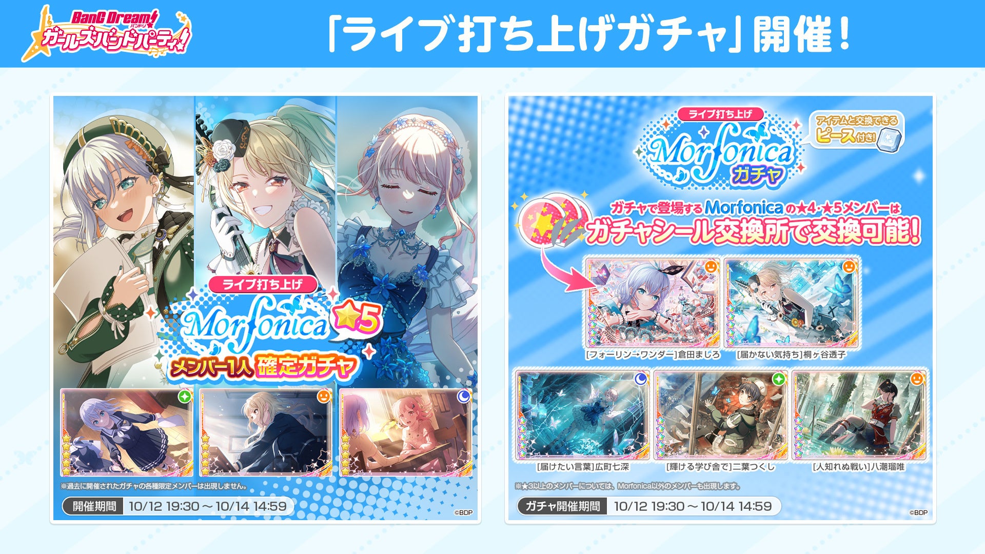本ライブ開催を記念して、「ライブ打ち上げガチャ」が開催中です。Morfonicaメンバーの出現率がアップするほか、様々なアイテムと交換できるピース付きとなります。
