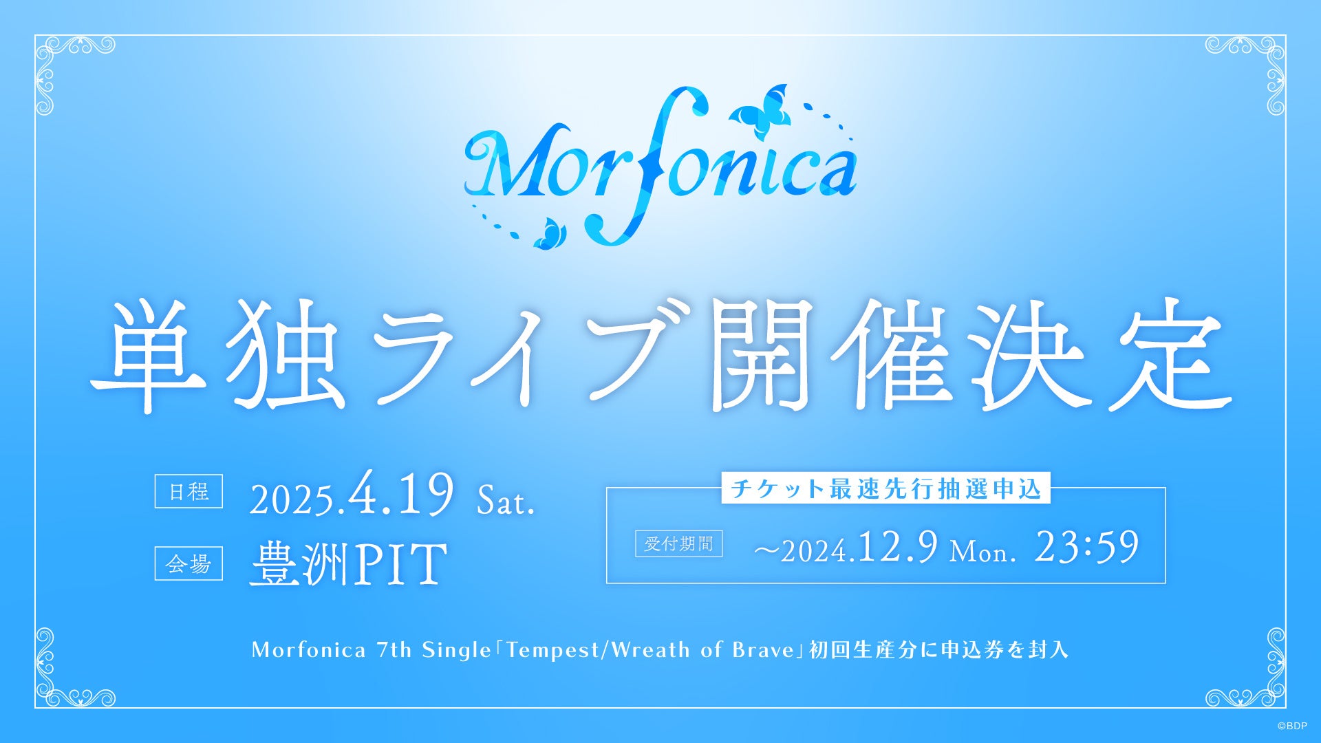 チケットの最速先行抽選申込券は、好評発売中のMorfonica 7th Single「Tempest/Wreath of Brave」初回生産分に封入されています。