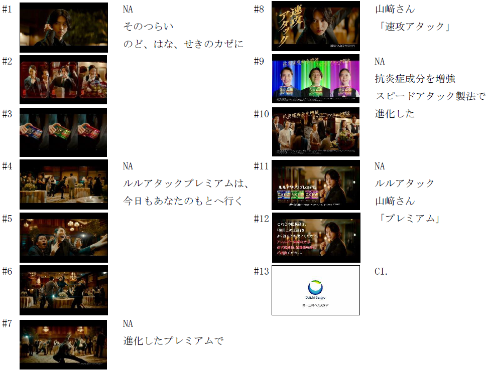 ビジネスカンファレンス会場でつらいカゼ症状を持つ人々を発見した山﨑さん。全力疾走で豪快に机を飛び超え、最短距離で「ルルアタックプレミアム」を差し出します。その後も、次々と症状に悩む人のもとへ駆け寄り、それぞれのカゼ症状にお勧めのルルアタックプレミアムを渡していきます。CM終盤にはキメポーズとともに「速攻アタック」と力強いセリフを放ちます。