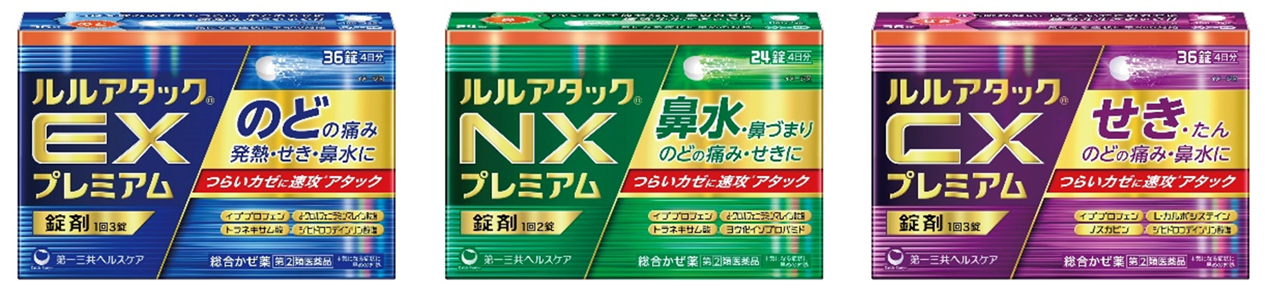「ルルアタックプレミアムシリーズ」は、抗炎症成分を強化(*1)し、水に溶けにくい性質を持つイブプロフェンが早く溶け出す独自の製剤技術「スピードアタック製法(*2)」を採用しています。ラインアップは、かぜによって起こる主な症状「のどの痛み」「鼻水・鼻づまり」「せき・たん」に合わせて選べる3品目をそろえました。