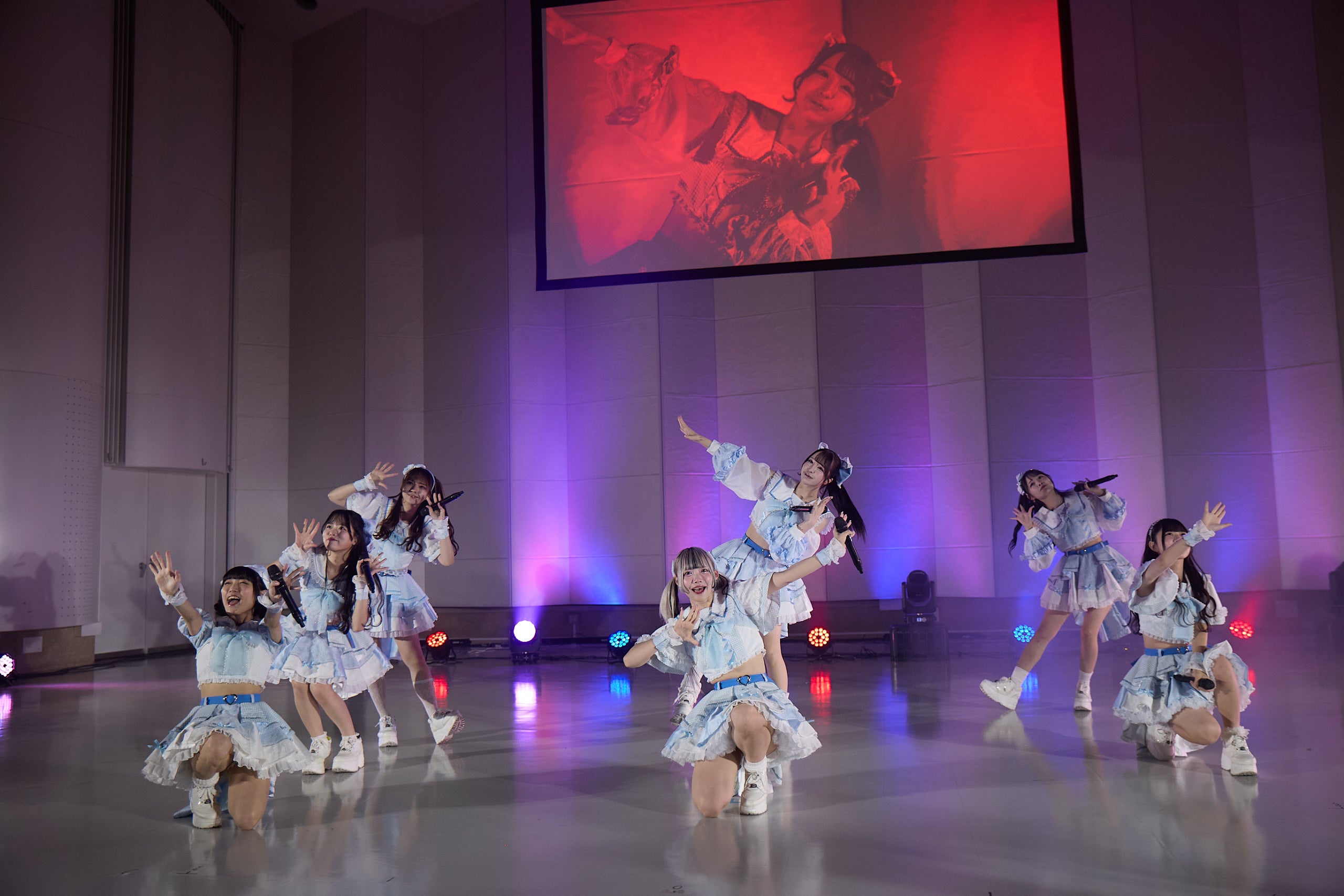 続けて登場したのは、名古屋発の王道系アイドルユニット「君に、胸キュン。」。TikTokをはじめ、SNSでもよく耳にする、YouTubeで277万回再生を達成中の楽曲「恋愛決壊警報」からステージがスタート。彼女たちを初めて見るであろう全国から集まったアイドルファンも、聞いたことのある楽曲だけに自然と客席も熱くなる。新曲「はなまるアニマル」や「シェアラブ」など5曲を披露。キャッチーなメロディーと歌詞で会場をキュンとさせた。