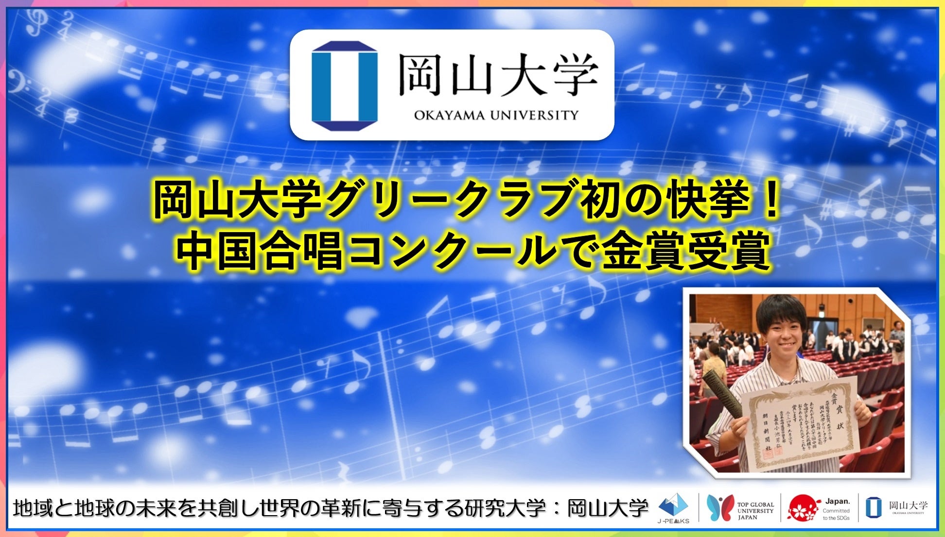 国立大学法人岡山大学(本部:岡山市北区、学長:那須保友)のグリークラブは、2024年9月21日に島根県民会館で開催された「第63回中国合唱コンクール」に出場し、金賞を受賞しました!中国大会での金賞受賞は、当団発足以来、初めてのことです。