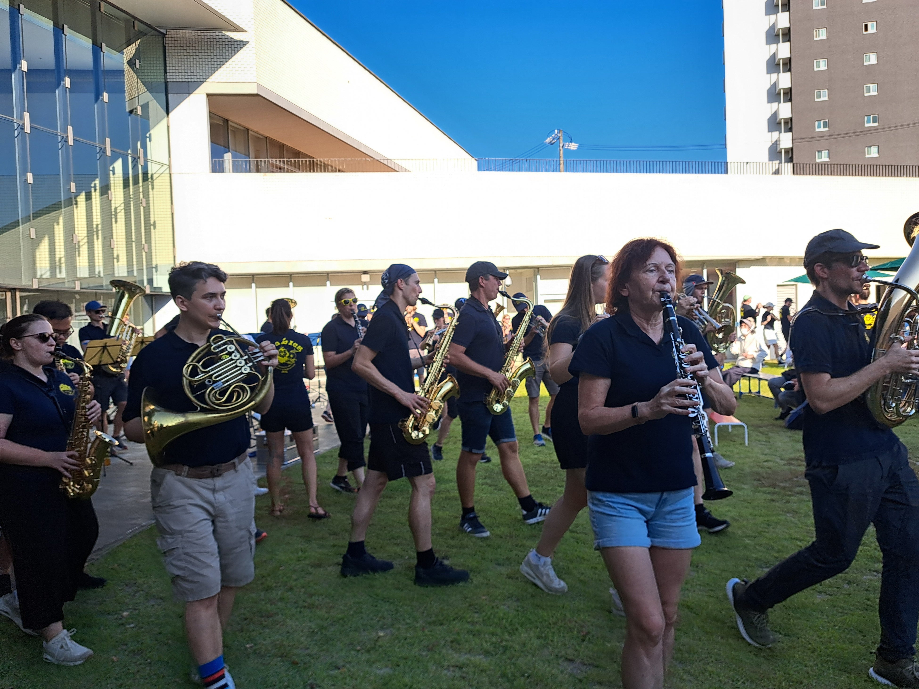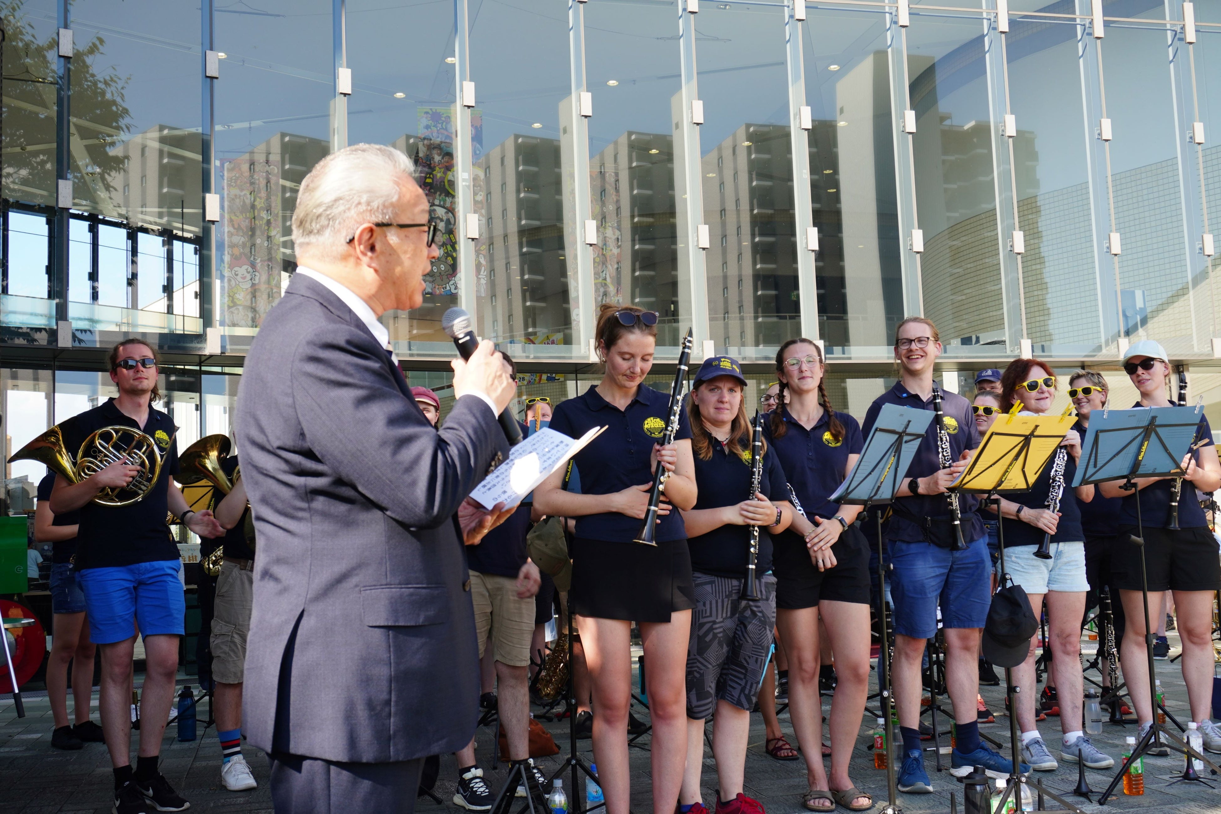豊橋市で10⽉13⽇(⽇)ドイツ・ブラウンシュヴァイク⼯科⼤学の吹奏楽団AkaBlasの野外演奏会がこども未来館ここにこで開催されました。⼤勢の観客の皆さんがAkaBlasの演奏に合わせて手拍子を打ったりリズムをとったりなど、晴天のさわやかな季節のなか、思い思いに楽しんでいました。