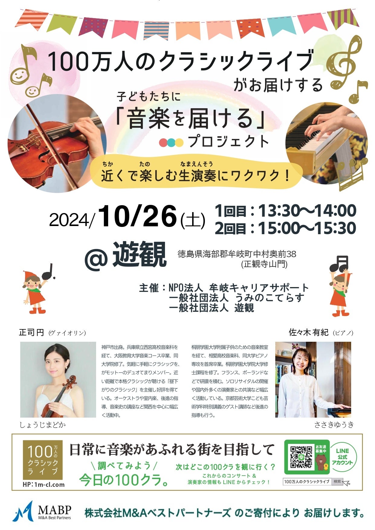 今回のクラシックライブは、M&Aベストパートナーズと100万人のクラシックライブの活動*の第73弾として開催するイベントとなります。「子どもたちに音楽を届けるプロジェクト」への支援として、“心がおどる”生の音色にときめく「場」の創出、感動の分かち合い、笑顔の人の輪を広げていくことを目指します。当日は、演奏家による解説つきでお届けいたします。