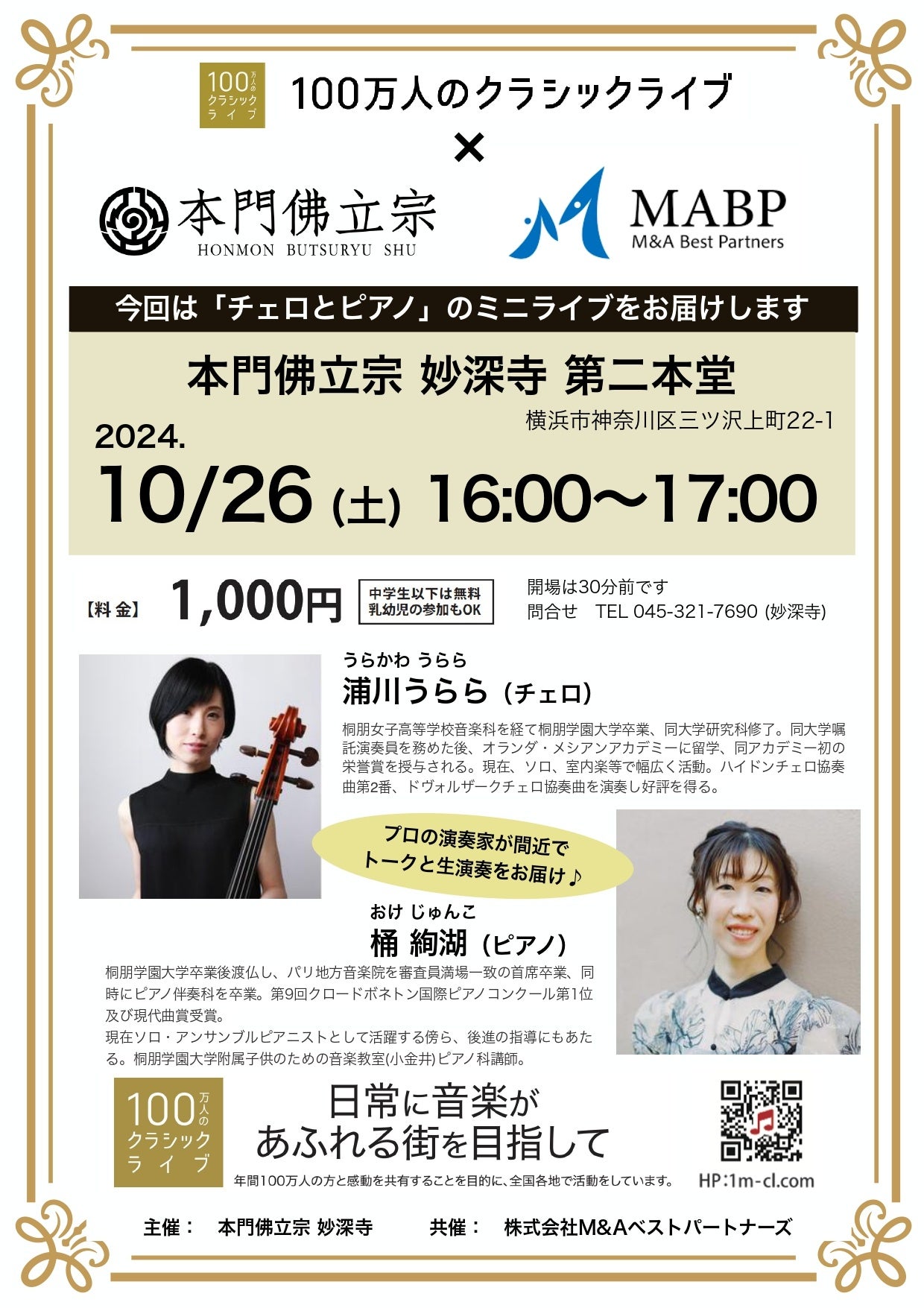今回のクラシックライブは、M&Aベストパートナーズと100万人のクラシックライブの活動*の第74弾として開催するイベントとなります。幅広い世代、様々な職種の人々が集まる”心の拠り所”であるお寺にてコンサートを行うことにより、“心がおどる”生の音色にときめく「場」の創出、感動の分かち合い、笑顔の人の輪を広げていくことを目指します。当日は、演奏家による解説つきでお届けいたします。