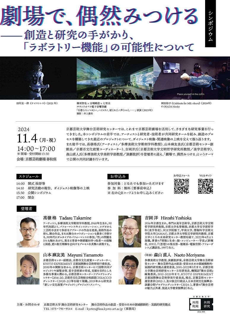 また後半では、高嶺格氏(アーティスト/多摩美術大学彫刻学科教授)、山本麻友美氏(京都芸術センター副館長/京都市文化政策コーディネーター)、吉岡洋氏(京都芸術大学文明哲学研究所教授/美学芸術学)、森山直人氏(多摩美術大学美術学部教授/演劇批評)を登壇者に迎え、公開の共同討議を行います。