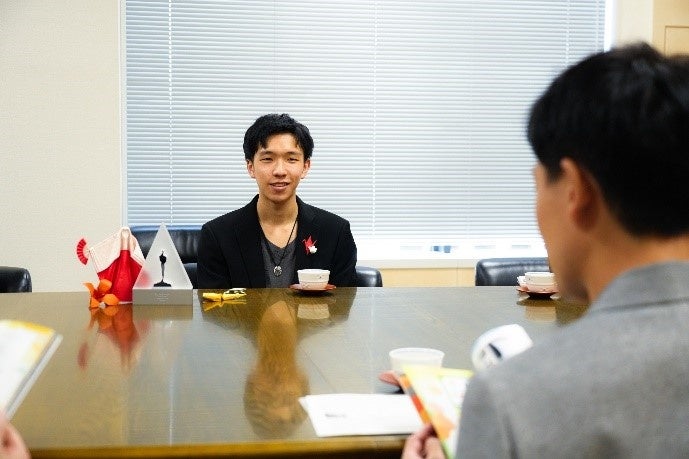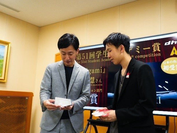 学生アカデミー賞のトロフィーと、受賞作品の「Origami」にも登場する金森氏が折紙で制作した作品を持参し、樋口区長を訪問しました。