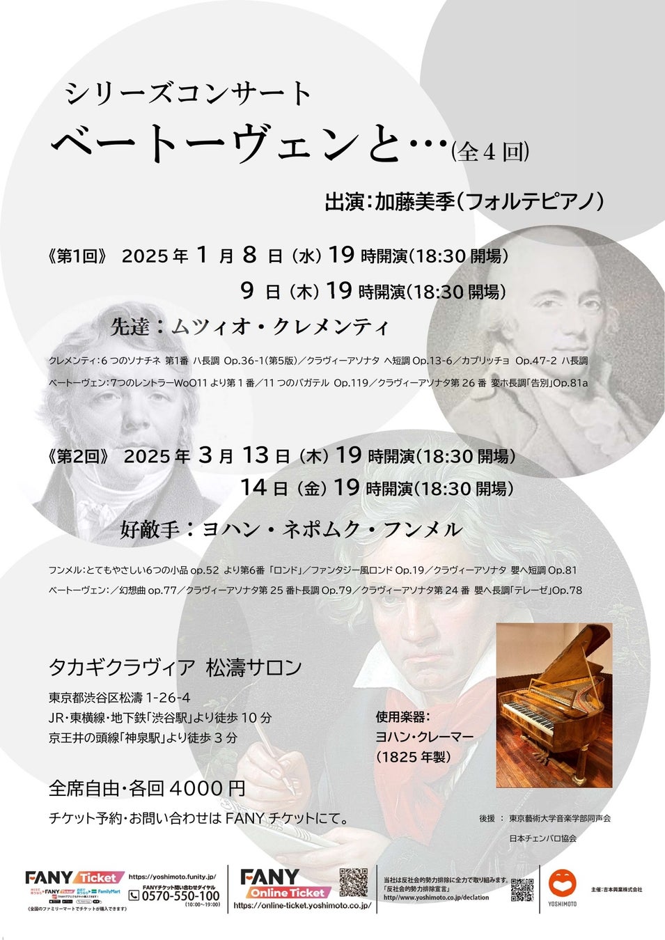18世紀後半から19世紀にかけて激動のヨーロッパを生きたベートーヴェン。当時の音楽家たちはだれもが彼を特別な音楽家と感じました。本シリーズでは、毎回ベートーヴェンと同時代に生き、関わった作曲家たちを取り上げます。解説を交えつつ、当時のウィーン式ピアノ