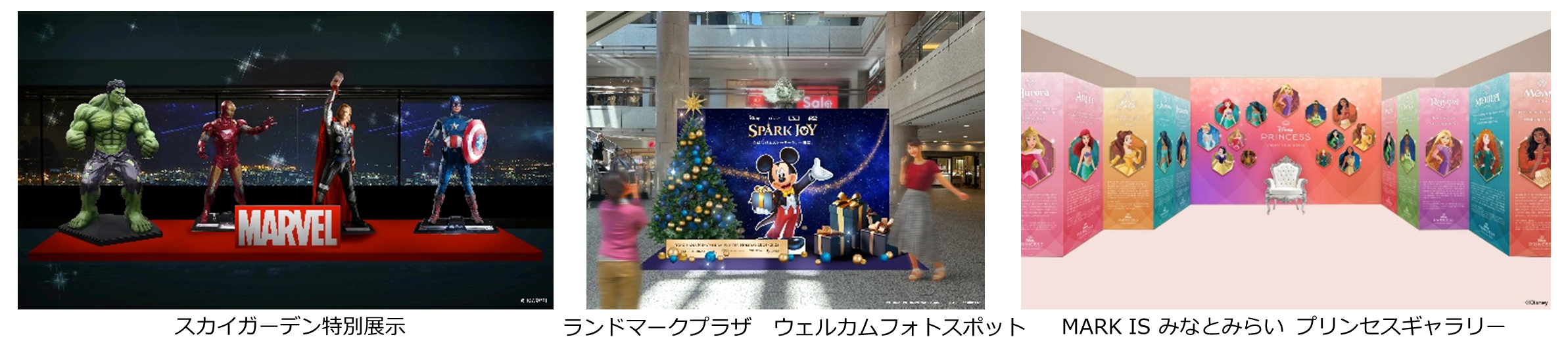 ランドマークプラザでは、ディズニー、ピクサー、マーベル、スター・ウォーズの4つのブランドの世界を表現した特別なツリーに加え、ミッキーマウスやスパイダーマンなどの人気キャラクターと写真が撮れるフォトスポットの設置や、4つのブランド36枚のキャラクターフラッグが館内を彩ります。横浜ランドマークタワー 69階展望フロア「スカイガーデン」では、マーベルとスター・ウォーズの特別展示を実施。スター・ウォーズの貴重なコレクションやマーベルを代表するヒーローたちの等身大スタチューなど、ファンにはたまらないコンテンツが盛りだくさんとなります。また、今回のホリデーイベント期間限定の特別なグッズ付き入場チケットの販売や、同フロア内にある「スカイカフェ」では、作品にインスパイアされた特別ドリンクをお楽しみいただけます。MARK IS みなとみらいでは、『アナと雪の女王』をイメージしたツリーに加え、レゴ®ブロックで作られたアナとエルサの展示や、13人におよぶディズニープリンセスのパネルが展示される「プリンセスギャラリー」を開催します。スカイビルでは、『トイ・ストーリー』をイメージしたツリーの展示の他、ピクサーのキャラクターと写真が撮れる様々なフォトスポットが設置されます。