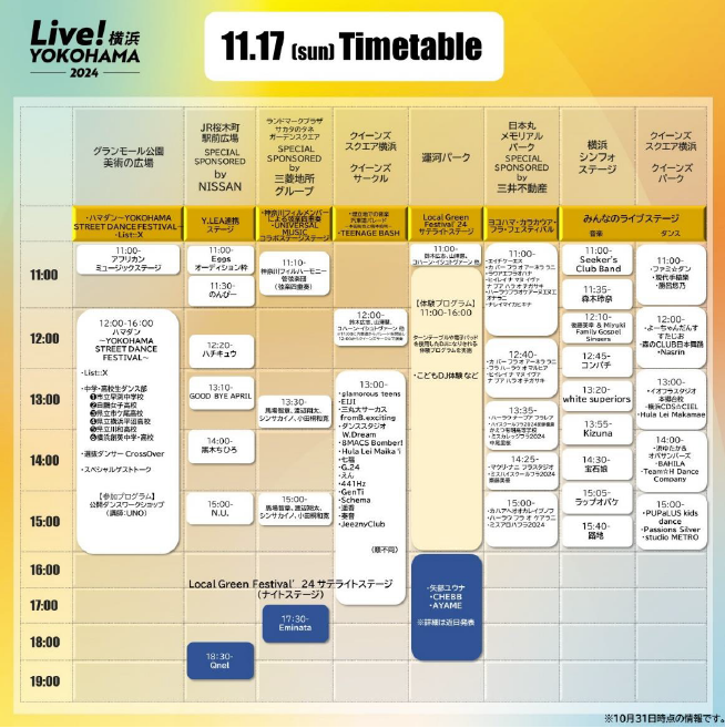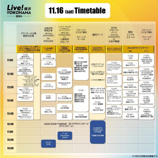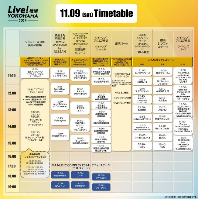 『Live!横浜2024』開催期間である11月9日(土)、10日(日)、16日(土)、17日(日)の4日間の8つの街なかステージの会場別タイムテーブルを発表します。
