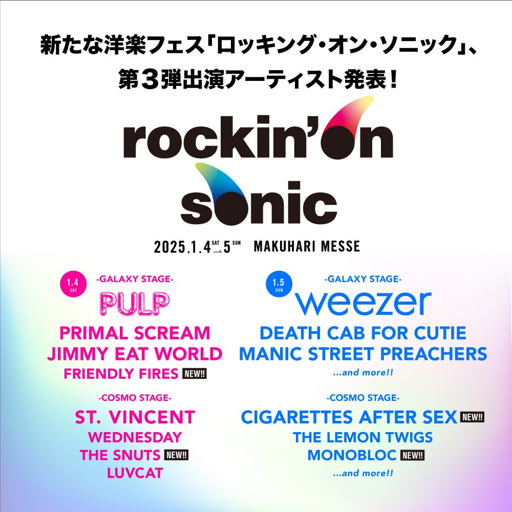 rockin’on sonic の第3弾追加アーティストとして1/4(⼟)出演の THE SNUTS と共に発表されたのは、昨年デビュー作が15 周年を迎えた踊れるロックの最終兵器 FRIENDLY FIRES。1/5(⽇)には欧⽶ではアリーナ級の会場をソールドアウトにするドリーム・ポップ・バンド CIGARETTES AFTER SEX、そしてロッキング・オンとクリエイティブマンがプッシュするニューヨークの新星MONOBLOCが追加となった。チケットは現在各プレイガイドにて発売中。