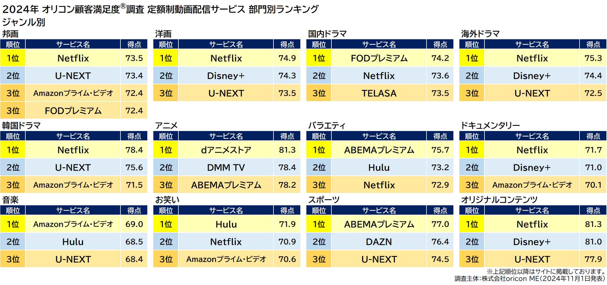 「アニメ」部門では【dアニメストア】が2017年の調査開始以来8年連続の1位を獲得。得点も前回の80.8点を0.5pt上回る81.3点を記録し、今回の『定額制動画配信サービス』ランキングの中で最も高い得点となる高評価を獲得しています(「オリジナルコンテンツ」部門1位と同点の最高得点)。また、「お笑い」部門では【Hulu】が3年連続、「国内ドラマ」部門では【FODプレミアム】が2年連続、「音楽」部門では【Amazonプライム・ビデオ】が2年連続4度目(2018年、2021年、2023~2024年)の1位となりました。