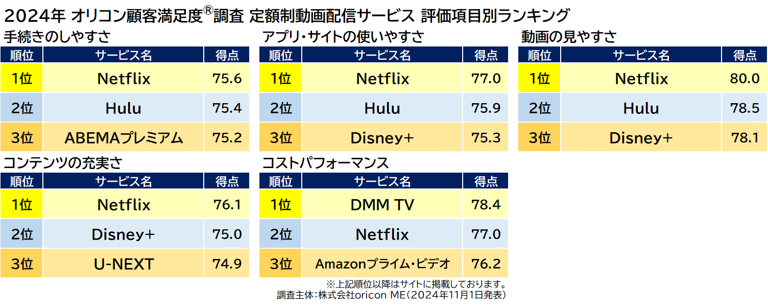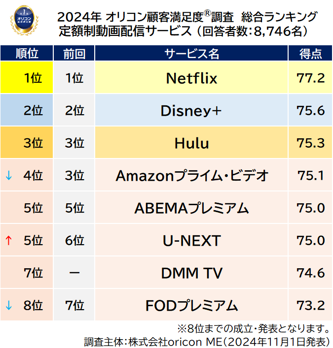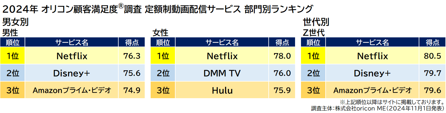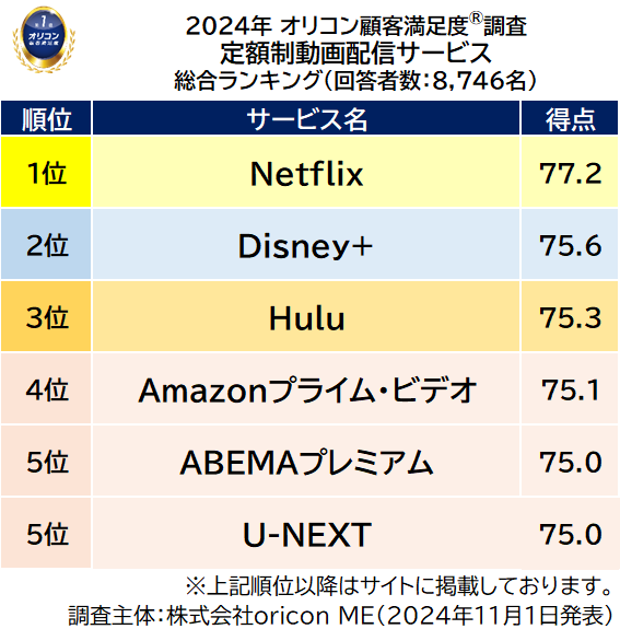 2017年の調査開始から8回目の発表となる今回は総合得点77.2点で【Netflix】が2年連続6度目(2017~2020年、2023~2024年)の総合1位を獲得しました。