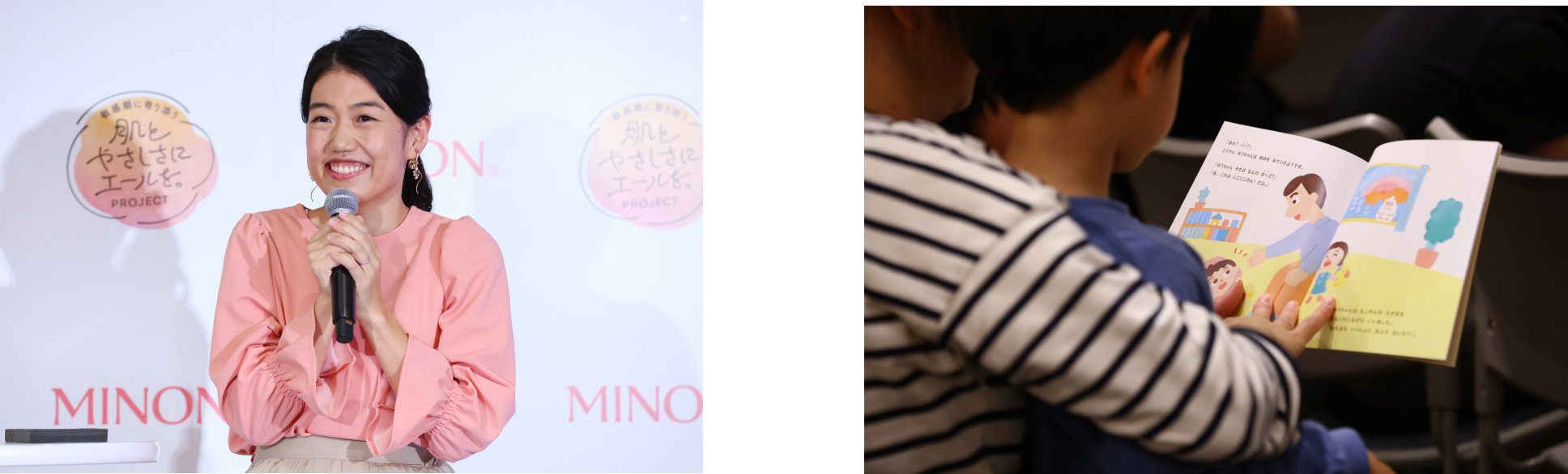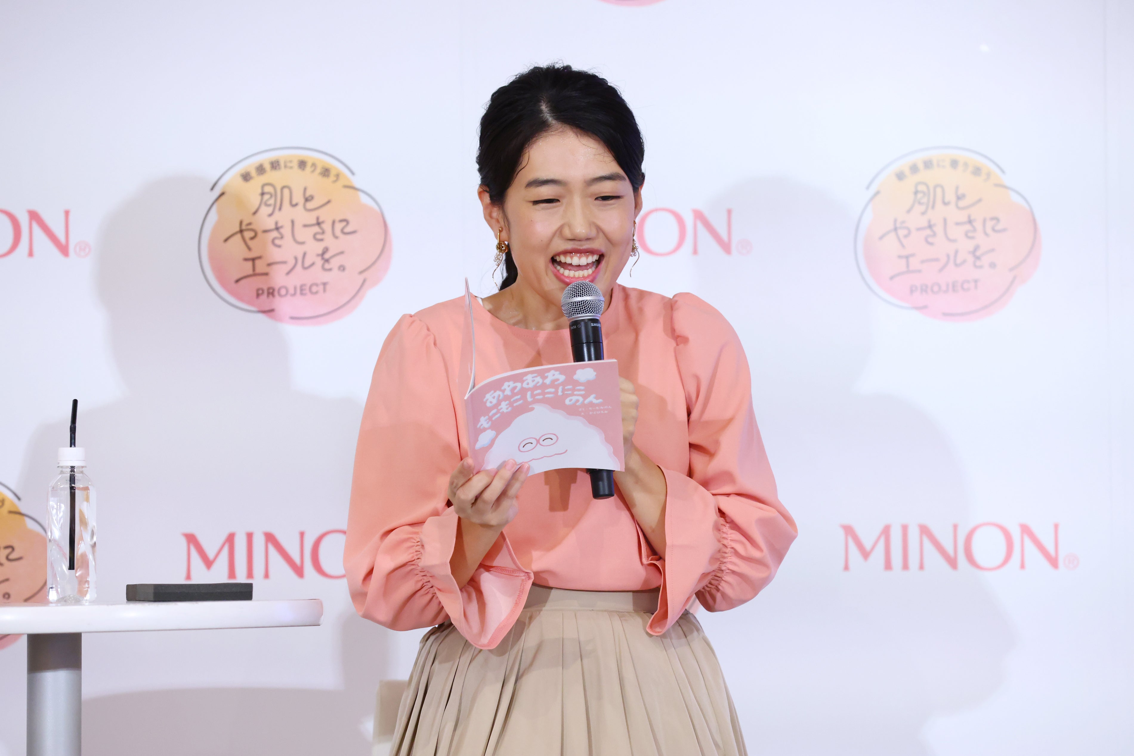 昨年ミノンブランドが50周年を迎えた際、お子さまやそのご家族へ肌ケアの大切さを楽しみながら学んでいただけるように、オリジナル絵本『あわあわ もこもこ にこにこ のん』を制作。当日は横澤さんにこちらの絵本を読み聞かせいただきました。普段からお子さまに読み聞かせしているという横澤さんは、慣れた様子で来場した子どもたちへ語り掛けるように絵本を読んでいただきました。読み聞かせを終えた横澤さんは「すごい緊張で汗だくになっちゃって、今私がお風呂に入りたくなっちゃいました」と一言。絵本のやわらかくやさしいタッチのイラストも気に入られた様子でした。
