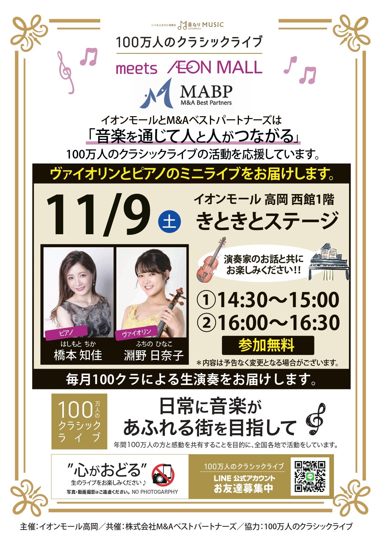 100万人のクラシックライブは、あらゆる人の日常に音楽の感動を届けることで、孤立を防ぎ穏やかで心豊かな社会生活を取り戻すきっかけとし、支え合いの輪を広げることを目指し、多くの方が行き交う『イオンモール高岡』にてライブを開催いたします。