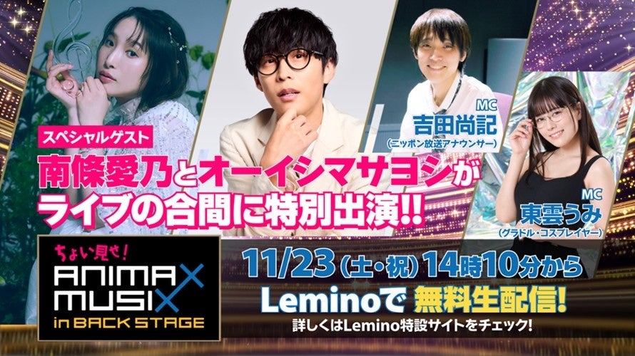 アニメ専門チャンネル『アニマックス』を運営する株式会社アニマックスブロードキャスト・ジャパン(代表取締役CEO:野島亮司、代表取締役社長:滝山正夫)は、株式会社NTTドコモ(代表取締役社長:前田義晃)と共催で、2024年11月23日(土・祝)に開催する「Lemino presents ANIMAX MUSIX 2024 FALL」の当日無料生特番「ちょい見せ!ANIMAX MUSIX in BACK STAGE」のMCに吉田尚記(ニッポン放送アナウンサー)、グラドル・コスプレイヤーの東雲うみ、スペシャルゲストとして南條愛乃、オーイシマサヨシが特別出演することを発表いたします。