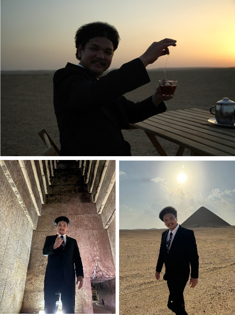 撮影当日は観光でいらした外国の方が僕らのすぐ側で突然チャネリングを始めたり、ピラミッド内が停電で真っ暗になるなど様々な事件もありましたが、とても刺激的で楽しい撮影現場でした。