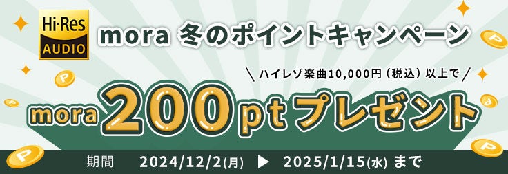 さらにハイレゾ音源を税込5,000円以上ご購入いただいた方に抽選で豪華オーディオ製品があたる「mora 2024-2025 Winter Hi-Res Campaign」やハイレゾ音源を税込10,000円以上ご購入いただいた方全員にmoraポイント200ptをプレゼントする「mora 冬のポイントキャンペーン」を実施いたします。