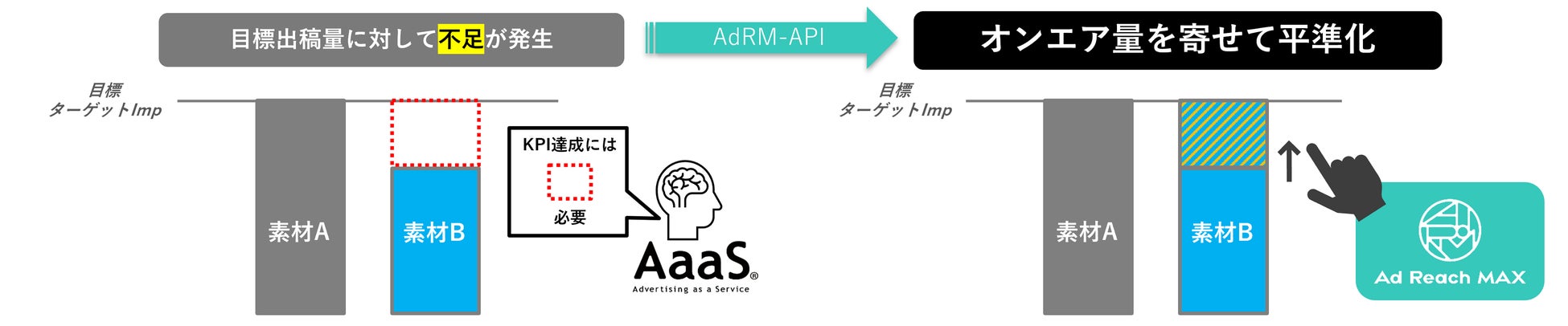 AaaSで、キャンペーン期間中に各素材の目標KPIに対する進捗を可視化しオンエア量を寄せることで各素材の目標出稿量に向けて平準化が可能となります。