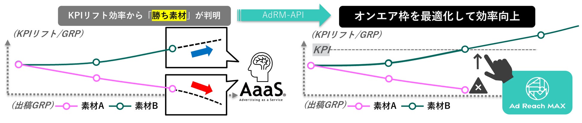 近年、マーケティングにおけるさまざまなデータ活用が進み、データに基づく柔軟な「運用型広告」へのニーズが高まっています。一方で、テレビ広告は、より自由で柔軟な運用ニーズが高まる中、オフラインでの手作業に依存したオペレーション設計によって様々な制約が存在していました。この課題に対して、AaaSはメディアデータや生活者データなどの多様なデータを統合し、テレビCMの広告効果を最大化するサービスを提供してきました。例えば、広告効果の高い放映枠を特定し、テレビCMの放映枠や素材を組み替えることで最適化を実施してきました。今回のAdRM-APIとのオンライン接続を通じてAdRMプラットフォームとAaaSが連携することで、KPIリフト効率やKPI進捗を踏まえたリアルタイムでの最適化運用が可能になります。