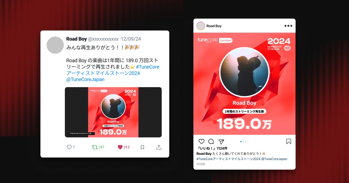TuneCore Japanは2022年より「アーティストマイルストーン」機能を提供。アーティストは一定の再生数に到達した楽曲を記念するマイルストーンページや画像(例「10,000再生を達成しました!」)をSNSなどでシェアし、普段からその喜びをSNSや自身のコミュニティで共有しています。