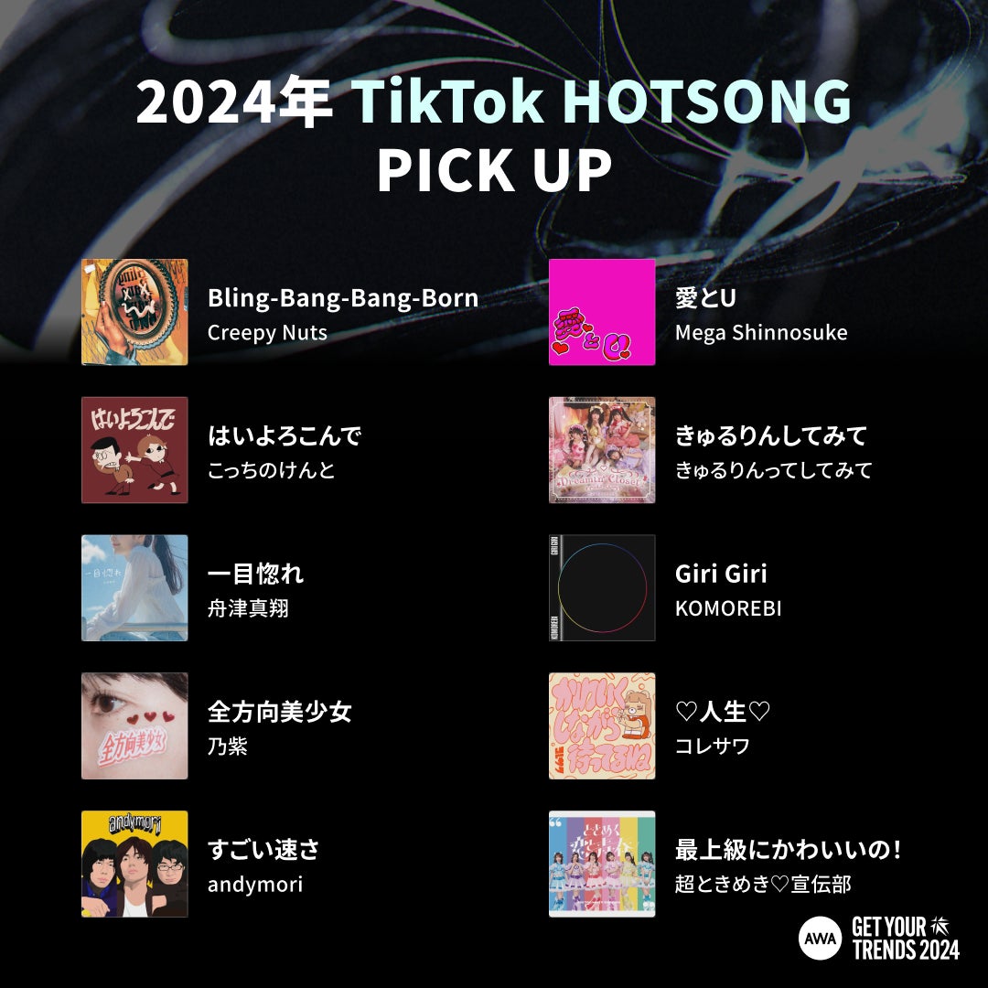 AWAの2024年よく聴かれた曲のランキングでも1位を獲得した、TikTokを中心としたダンスチャレンジ動画をきっかけに人気となったCreepy Nutsの「Bling-Bang-Bang-Born」をはじめ、YouTube上のMV再生数1億2,000万回超えを記録し、ギリギリダンスの踊ってみた動画も多数投稿されたこっちのけんとの「はいよろこんで」や、本人の弾き語り動画や振り付け動画、歌ってみた動画、本曲を使用した一目惚れ予測エフェクトが拡散し、各チャートを賑わせた舟津真翔の「一目惚れ」など、2024年TikTokで話題となった楽曲が年間HOTSONGに選ばれています。この続きは、TikTokの年間HOT SONGを収録したプレイリストでお楽しみください。
