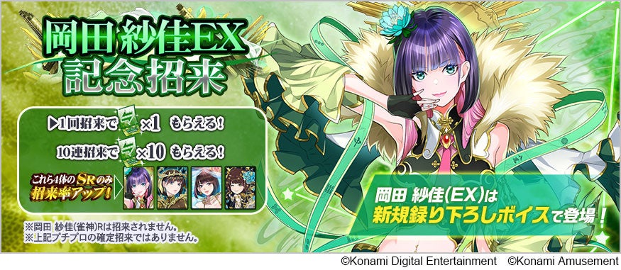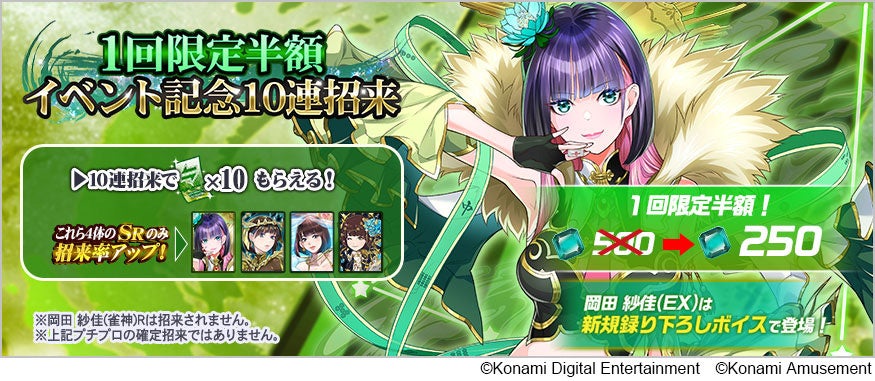 イベント期間中、「1回限定半額 イベント記念10連招来」や「岡田紗佳EX記念招来」でプチプロ「岡田 紗佳(EX)」が新たに登場します。