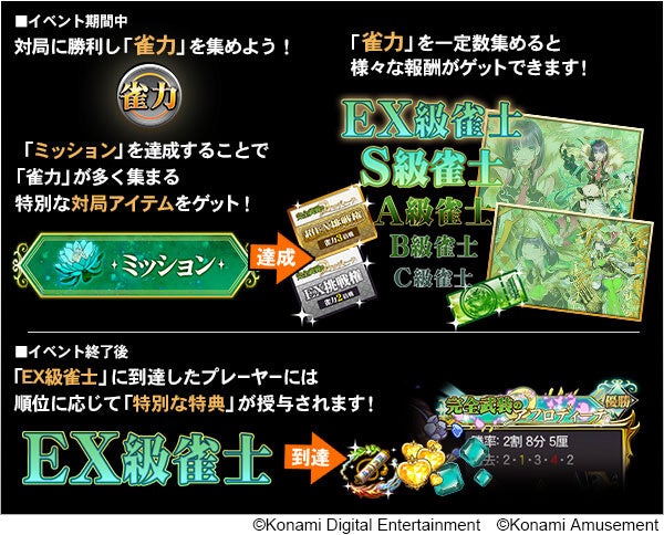 他にも、上位に入賞すると特典が獲得できる「全国大会」を開催します。ミッションをクリアすると、「プロ雀士マッチング抽選権」などがもらえます。