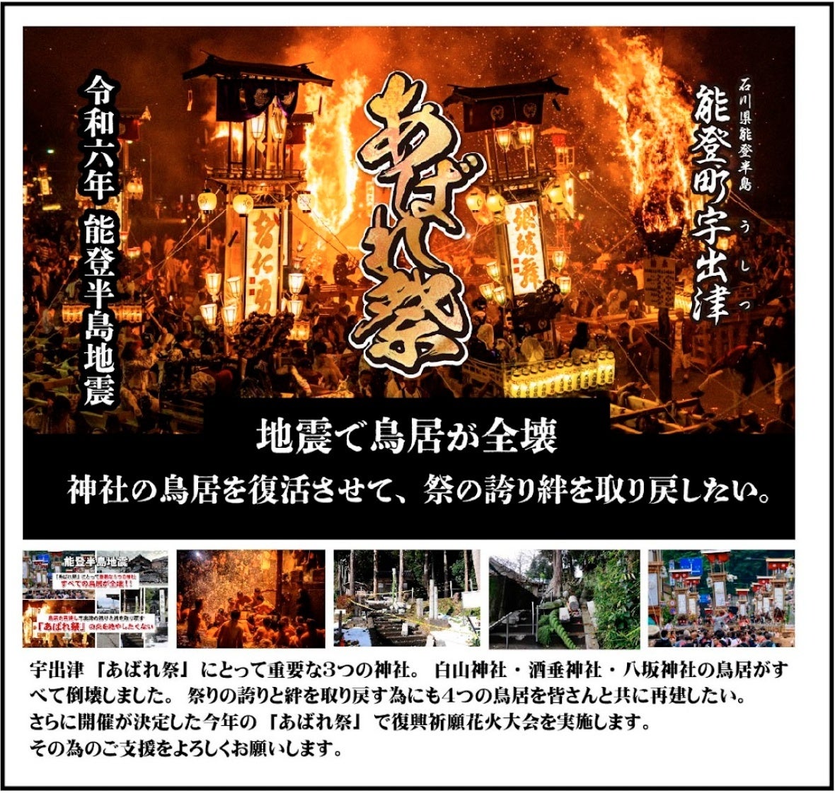 The Noto peninsula earthquake collapsed the torri gate of the shrine, which is very important for the Abare Matsuri. We ask for your support to cover the cost of rebuilding the torii gate and for the fireworks festival to be held to pay for reconstruction.