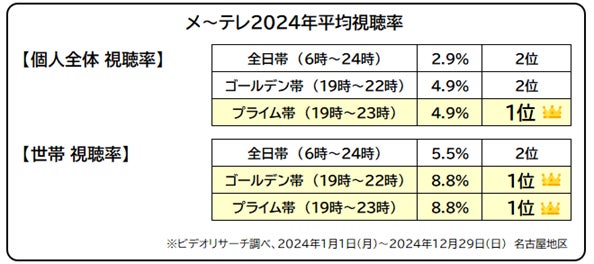 メ~テレ(名古屋テレビ放送)は、2024年の年間平均視聴率で、個人全体はプライム帯トップ1冠、世帯はゴールデン帯・プライム帯の2冠を獲得しました。年間の平均視聴率で個人全体のプライム帯、および、世帯のゴールデン帯とプライム帯の両方が1位となったのは、2013年以来となります。