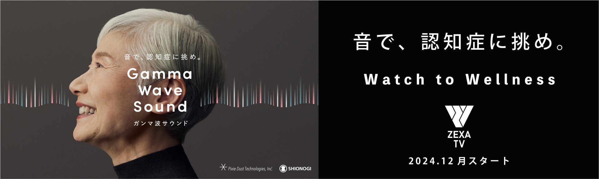株式会社ゼクサバース(本社:東京都千代田区、代表取締役社長:上瀧良平、以下「ゼクサバース」)と、ダイバーシティ&ヘルスケア領域での研究開発と事業化に取り組むピクシーダストテクノロジーズ株式会社(本社:東京都中央区、代表取締役会長CEO:落合陽一、代表取締役社長COO村上泰一郎、以下「PxDT」)は、PxDTと塩野義製薬が共同開発した、日常生活を送りながら認知機能ケアできる可能性のある音、「ガンマ波サウンド™」を活用した日本初のテレビレギュラー番組放送を開始したことをお知らせいたします。