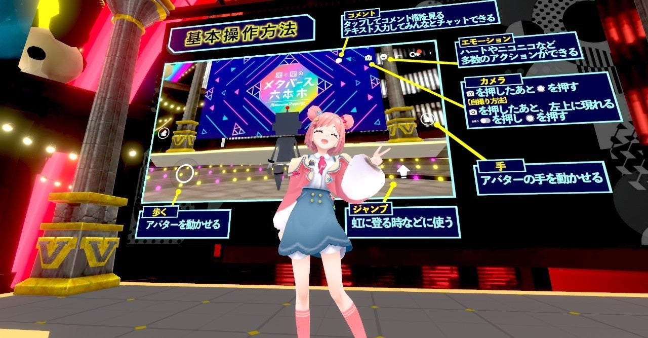 cluster初心者のユーザーにも楽しんでいただけるように桜葉ハグによる操作説明やメタバースを楽しむコツが紹介されました。大西アナウンサーもメタバースデビューということで、参加者のみなさんと一緒に操作方法を教わりながら進行していきます。