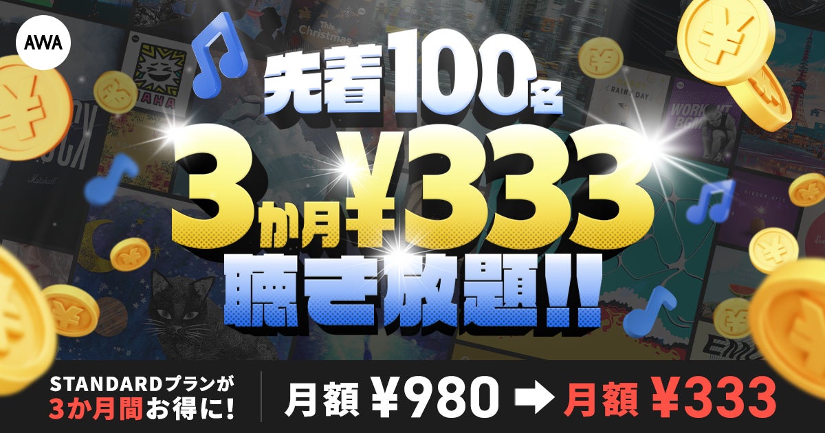 AWAでは日頃のご愛顧に感謝を込めて、【先着100名様限定 3ヶ月¥333で聴き放題!!】を実施いたします。本キャンペーンは、2025年3月15日(土)~3月23日(日)の期間中に、キャンペーンサイト経由でAWAのSTANDARDプランに初めてご登録いただいた方先着100名様を対象に、通常月額980円のSTANDARDプランが毎月333円で3ヶ月間ご利用いただけるものです。初月無料のトライアル期間もございますので、最大4ヶ月お得にご利用いただけます。