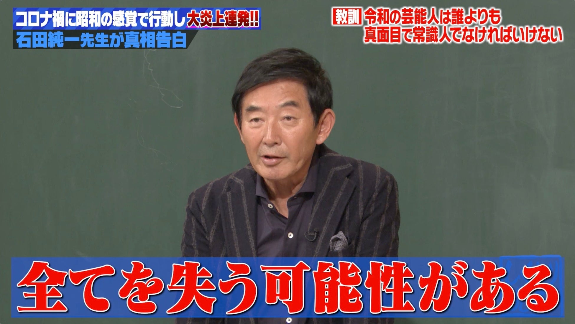 授業の冒頭、「コロナ禍に大炎上して40回も週刊誌に載った」と明かした石田先生は、コロナ禍で起こした数々のしくじりによって「CM8本降板」「レギュラー番組が全て打ち切り」「別荘・ゴルフの会員権・車・自宅を売却」「ほぼ無収入状態」という事態に陥ってしまったと告白します。
