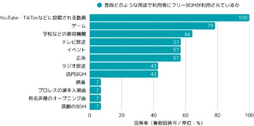 さらに、フリーBGM作曲家に対する調査において、作曲したフリーBGMの利用が最も多いカテゴリは、「YouTube並びに、TikTokなどに投稿される動画」が多く、次いで「ゲーム内」、「学校などの教育機関」という結果となっているほか、テレビ番組、イベント会場、広告で利用されるケースが増えてきていることも明らかになりました。