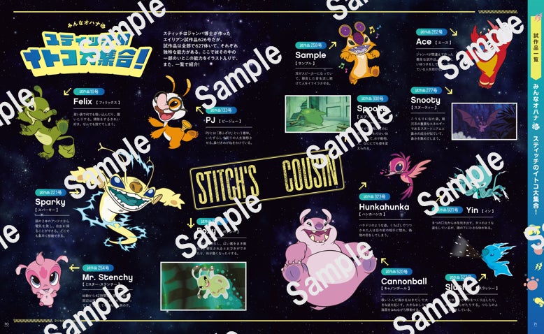 スティッチを語る上では欠かせない、声優・山寺宏一さんのスティッチ愛が伝わるメッセージを掲載。ほかにも、スティッチ・クロニクル、スティッチの627体のイトコ一覧、エンジェル&リロイの紹介など、豊富なイラストと映画・アニメシーン画像を織り交ぜた特集を収録しています。
