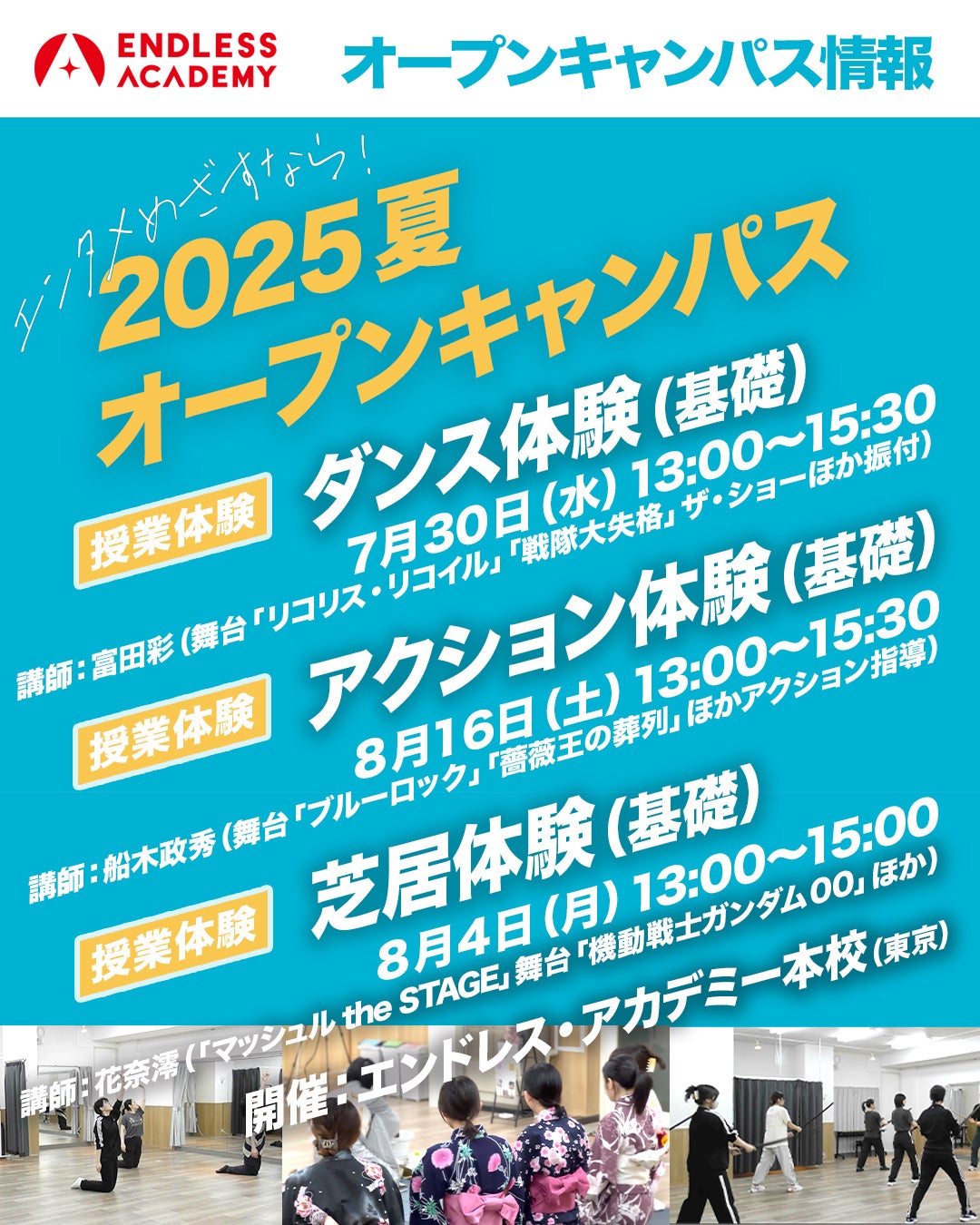 総合芸術学校『エンドレス・アカデミー』は2025年夏に、よりすぐりの講師による特別講座や無料で参加できる授業体験オープンキャンパスを実施いたします。