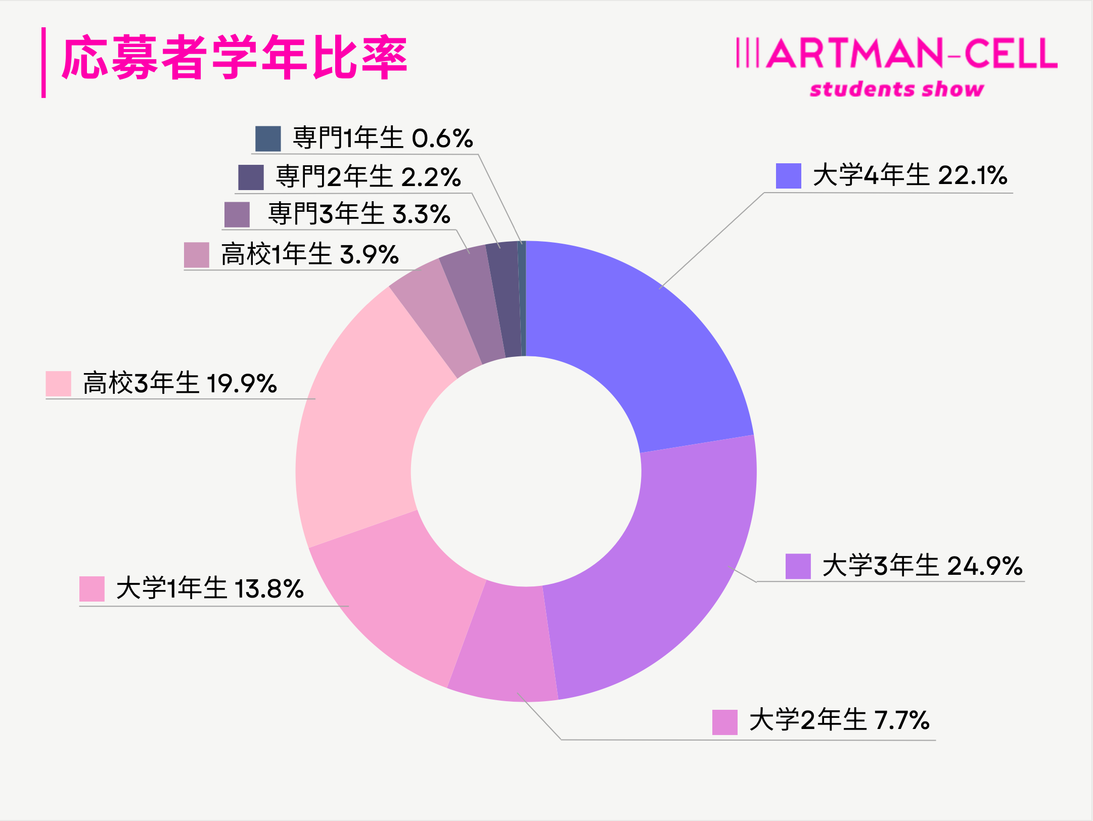 参加者の中心は大学3年(24.9%)、大学4年(22.1%)、高校3年(19.9%)で、進学・就職などの節目にあたる学年が全体の約67%を構成。大学1・2年生、専門学校生、高校1・2年生からの参加もあり、Z世代の中でも幅広い段階から、創造的なプロセスに呼応する層が集まりました。
