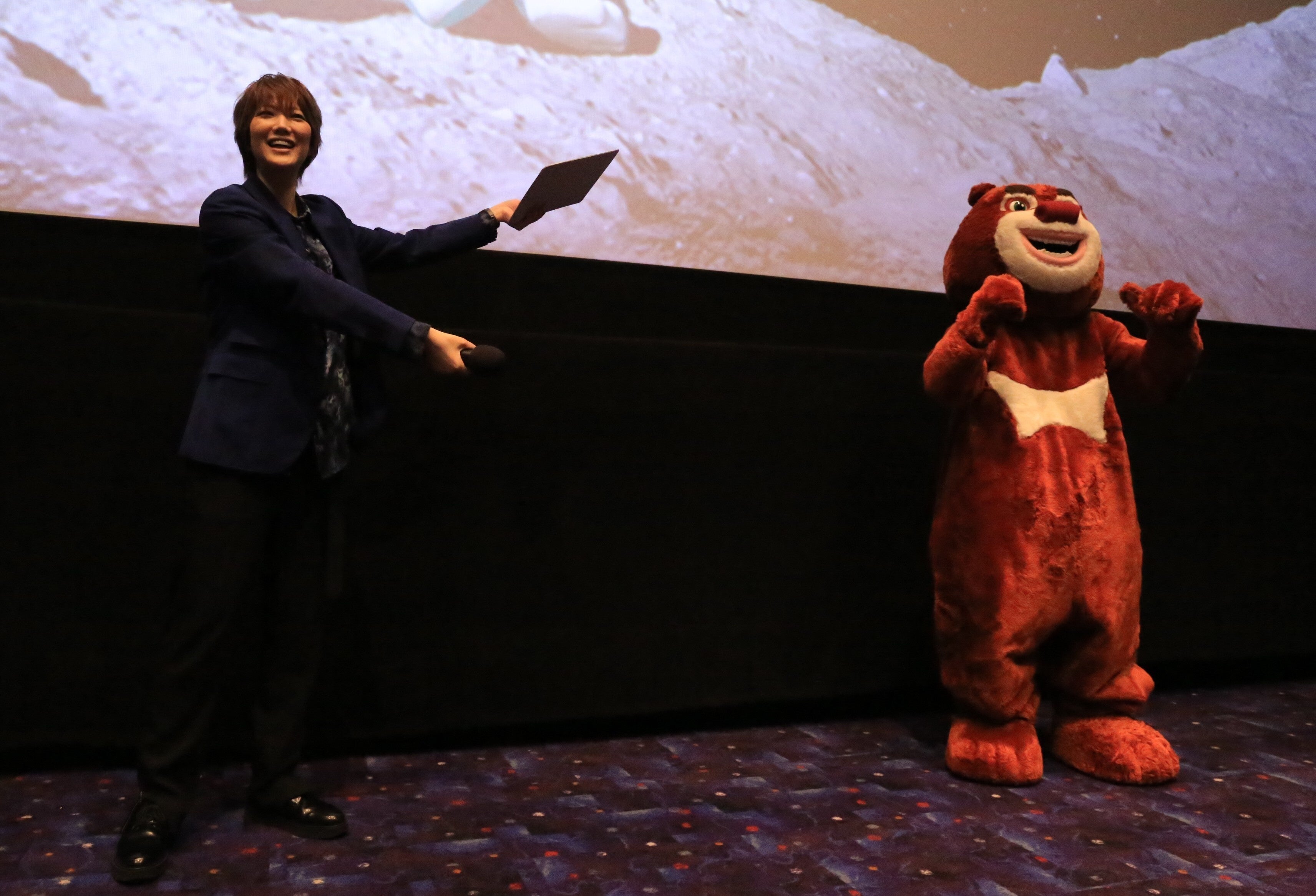 10月11日(土)に、アニメ映画『くまじろう!ちきゅうをすくえ! ~熊出没~』の完成披露試写会が行われました。本映画の日本語吹き替え版を公開するのは当イベントが初。会場にはその全容を全国公開よりも一足先に楽しもうという100名を超えるファンの方々が集まりました。上映後には、七海ひろき(アブ役)・くまじろう・くまたろうが登壇。MCからの質問を答える中で、映画の見どころや、クイズ大会、じゃんけん大会など、大変盛り上がり、会場全体が明るい雰囲気に包まれました。