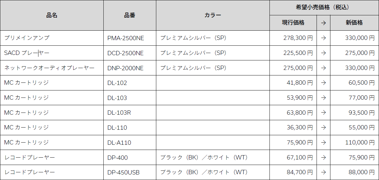 デノンは、2026年1月16日(金)に下記の通り、一部製品およびカートリッジの針交換の価格改定を実施することをお知らせいたします。