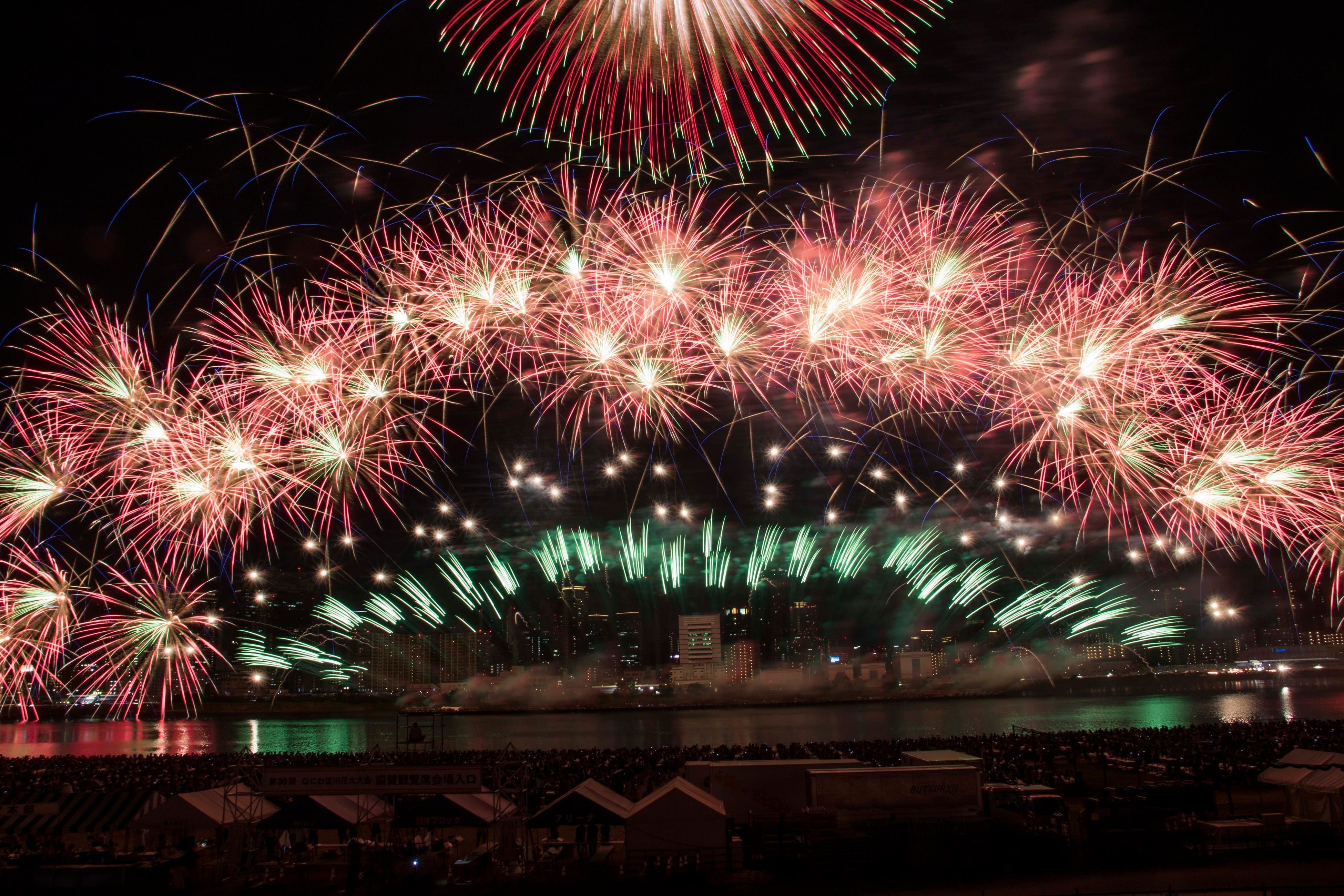 今年の「なにわ淀川花火大会」では、都市型の花火大会では珍しい「一尺玉」(直径約30cm)の大花火が、高さ約300mまで打ち上がり、なにわの夜空を豪快に彩ります。