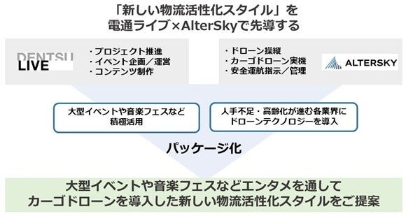 物流ドローン及びドローンショーの企画・運航サービスを提供する株式会社AlterSky(所在地:愛知県豊田市、代表取締役CEO:村井宏行、以下「AlterSky」)は、株式会社電通ライブ(本社:東京都中央区、代表取締役社長執行役員:髙木正彦、以下「電通ライブ」)、PYRAMID GARDEN実行委員会と共同で、近い将来の新たな物流スタイルとして注目される「カーゴドローン」に焦点を当てたプロジェクト「BLUE SKY LIVE」を始動し、社会実装に向けた実証実験を開始いたしました。