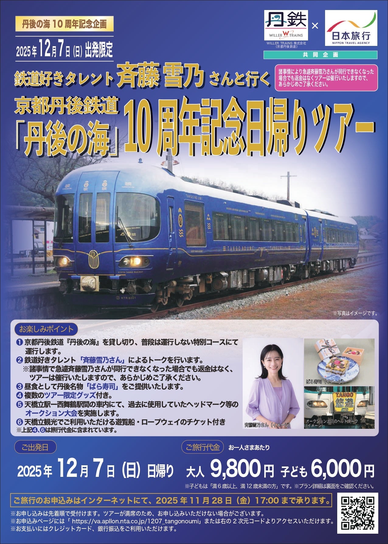 京都府北部および兵庫県北東部を走る京都丹後鉄道(以下「丹鉄」)のKTR8000形気動車の特急列車『丹後の海』は、2015年に運行を開始し、今年で10周年を迎えます。丹鉄を運行するWILLER TRAINS株式会社(本社:京都府宮津市 代表取締役:飯島徹)と株式会社日本旅行(本社:東京都中央区 代表取締役社長:吉田圭吾)は、『丹後の海』をはじめ、丹鉄をご利用のみなさまや沿線地域のみなさまへの感謝の意を込めて、「鉄道好きタレント斉藤雪乃さんと行く『丹後の海』10周年記念ツアー」を、本日2025年10月30日(木)より発売します。