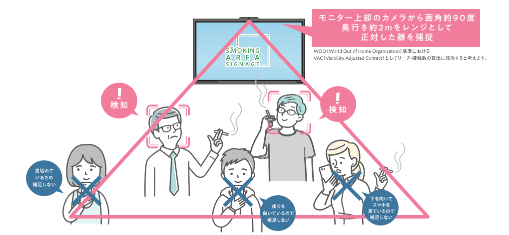 そのため顔の検知を取りやすく、精度の高い視聴計測を行うことができる点は他のメディアにはない「SMOKING AREA SIGNAGE」ならではの特性だと考えております。