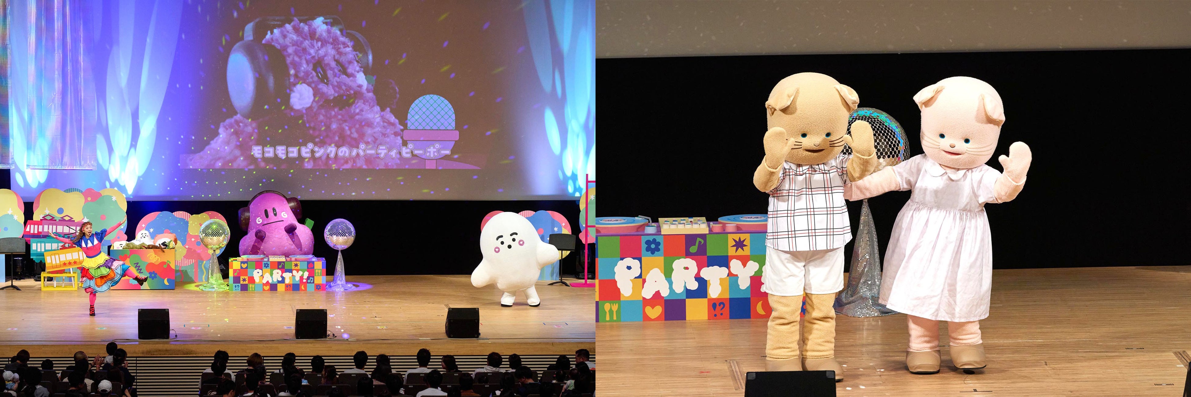 会場の幕が上がり、メインキャラクターの「ぷしゅぷしゅ」はもちろんのこと、「にゅう」や「ひーたんみーたん」、さらに、今年の映画で初登場した「ぱるてぃ」が登場すると、会場から「わ~!」と大きな歓声が上がり、一生懸命に指さして反応する赤ちゃんの姿も。